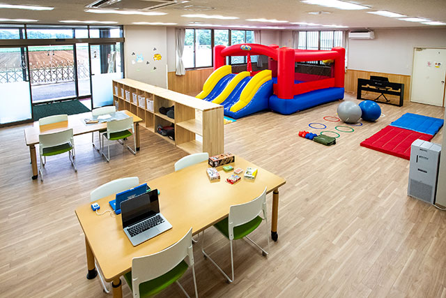 放課後等デイサービス ここは児童福祉法、放課後等デイサービスガイドライン(厚生労働省)等の関係法令等に則った、指定放課後等デイサービスです。事業所の特徴は何といっても広い活動スペースとバリアフリーな施設環境です。“ここ”では、小学生から高校生までの様々な障害を持った子どもたちが互いに交流し、一緒に活動に取り組みます。幅広い年齢層の子どもたちが共に過ごすことで、年上の子が年下の子の面倒を見る姿はとても自然に感じ、またこの関係は子どもたちの手によって当然のこととして年下の子へ受け継がれているようにも見えます。